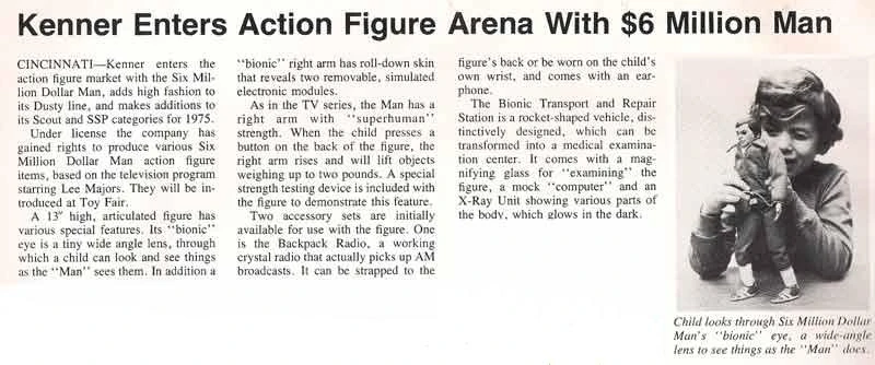 The original action figure came out in 1975, and carried a Kenner product ID of 65000. It was sold with an engine block that the user could slide into Steve's right hand in order to demonstrate the lifting power of what Kenner called the "Bionic Power Arm", which was activated by pushing a lever-button on the doll's back.