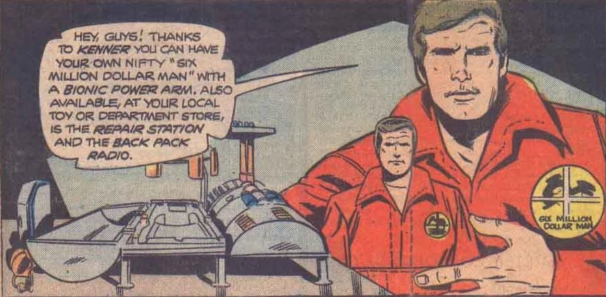 The Six Million Dollar Man action figure was heavily promoted with TV ads and print advertisements in comic books and magazines. Direct references to the doll also occurred in licensed spin-offs and the series itself. The second issue of the Six Million Dollar Man comic book featured the action figure in a starring role, with the villain using it in a voodoo doll-like manner to try and kill Austin; the issue ends with Austin breaking the "fourth wall" and telling readers about the action figure, which is shown prominently on the comic's Neal Adams-drawn cover. A subtle reference to the doll can also be heard in "Elves' Revolt", one of the stories on the Christmas Adventures story record, when Santa Claus suggests that a Steve Austin action figure would be a popular Christmas gift.